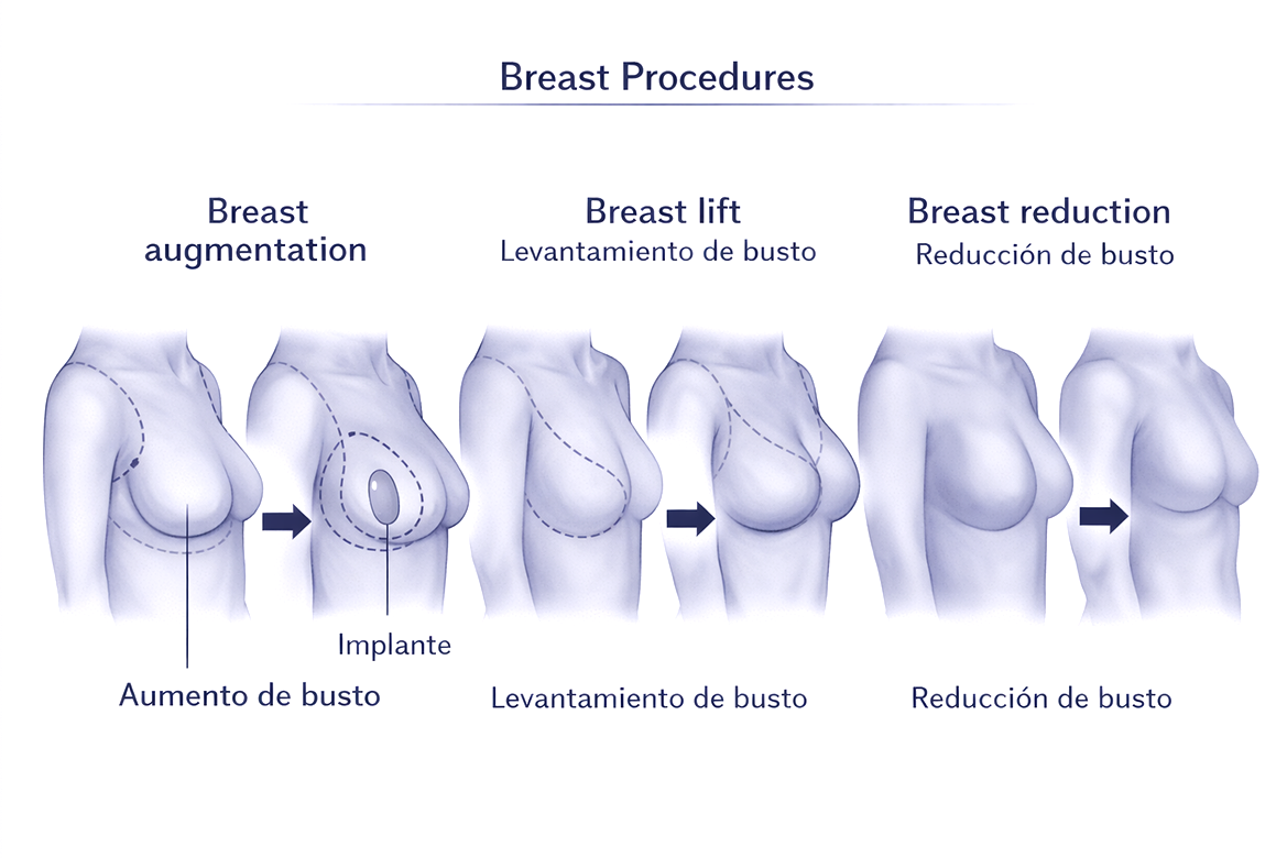 Breast procedures are aesthetic surgeries focused on changing the size, shape, or position of the bust to achieve better body proportion and balance. The most common options include breast augmentation, breast lift (mastopexy), and breast reduction. An evaluation with the specialist helps determine which option best fits your needs.Volume adjustment (augmentation or reduction). Lift and firmness (mastopexy). Improved proportion and contour.